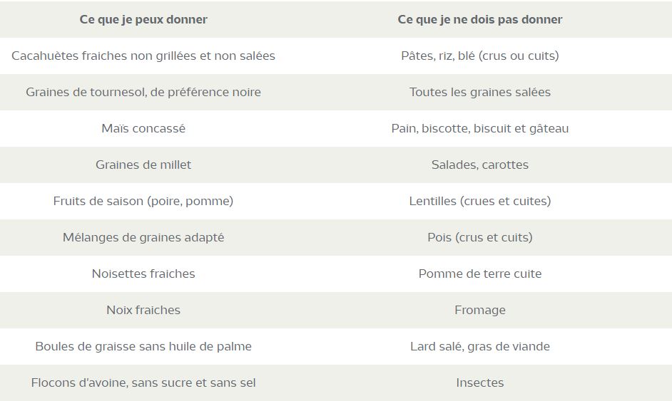 NON !  La LPO BFC conseille de les nourrir uniquement en période de froid prolongée, soit de novembre à fin mars. Leur donner à manger en dehors de cette période peut causer de nombreux problèmes, comme par exemple un dérèglement du cycle alimentaire des oisillons, des transmissions de maladies ou encore un déséquilibre de l'écosystème des espèces.